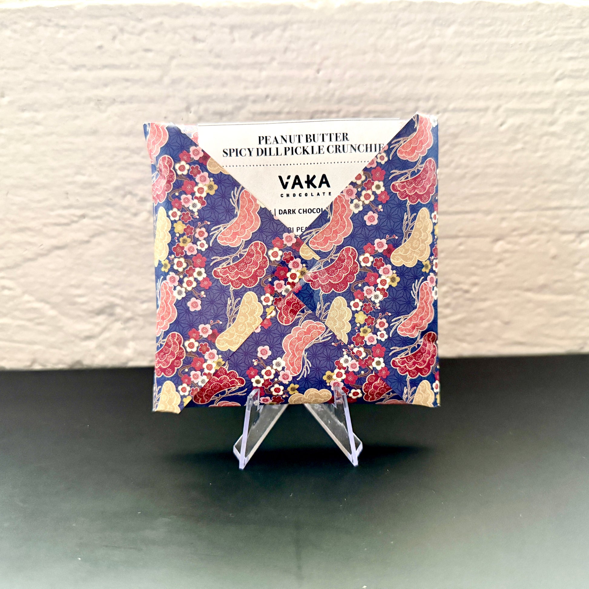 Peanut butter dark milk with Hardbite spicy dill pickle chips, dill pickle and maple smoked sea salt.