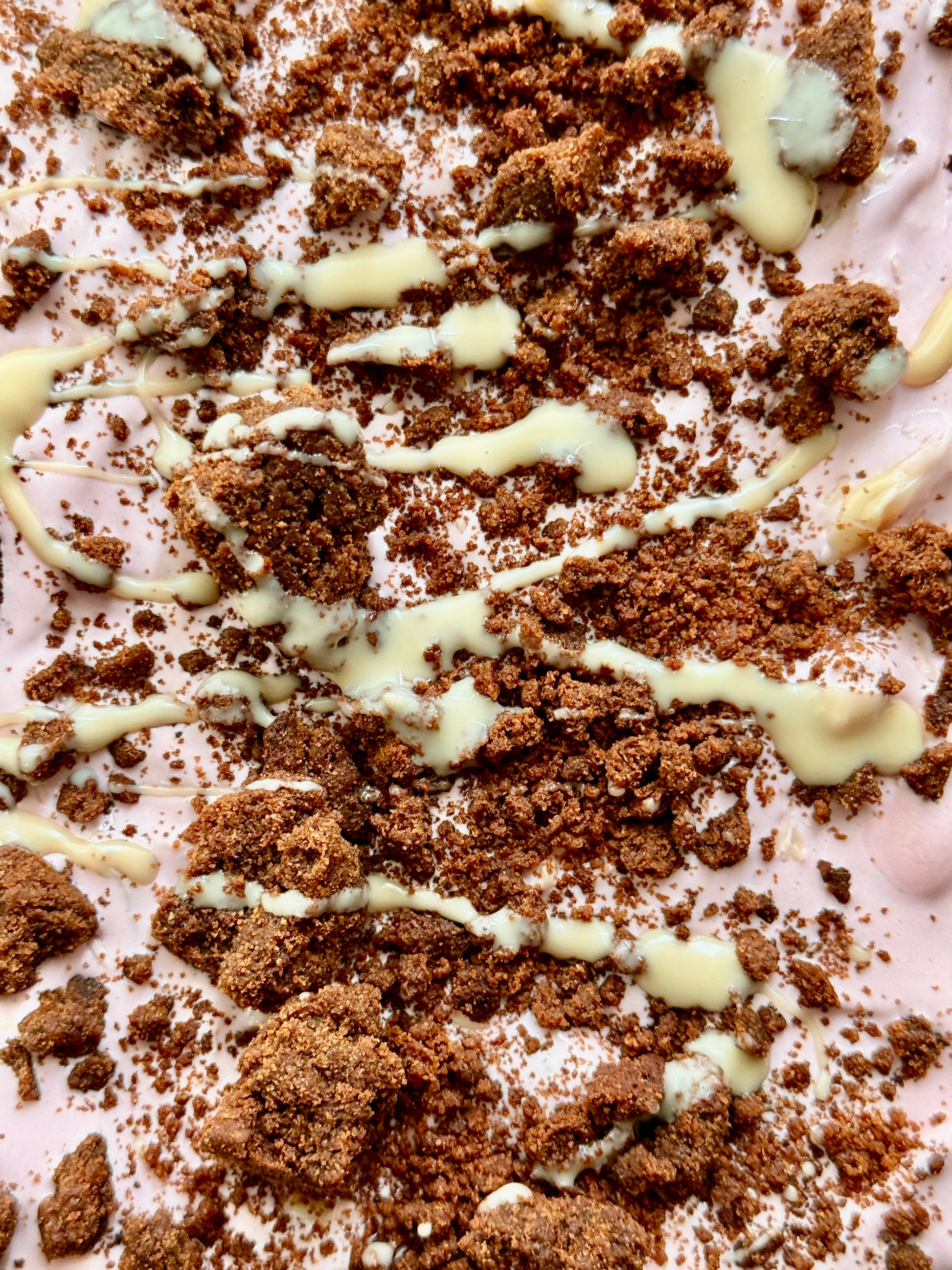 Cream cheese pink cream + white chocolate freckle + chocolate crumblets.